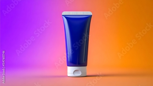 Stylish Blue Cosmetic Tube Against Vibrant Gradient Background, A high-quality, studio shot of a blank, glossy blue cosmetic tube, likely for cream or lotion.