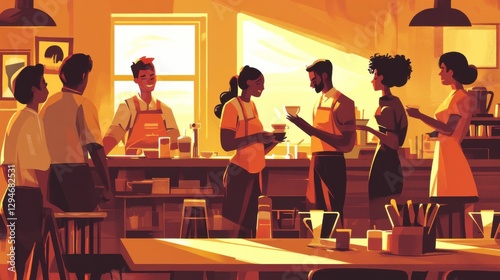 Stylish Cafe Scene with Warm Tones and Efficient Service
