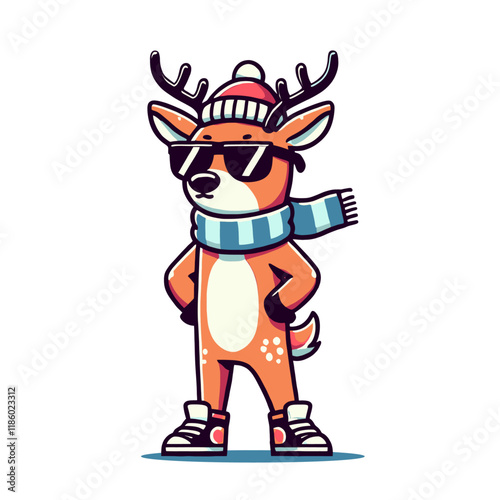 Stylish cartoon reindeer wearing a winter hat, scarf, and sneakers, standing confidently. Perfect for festive, winter, or trendy-themed designs. Isolated vector illustration.