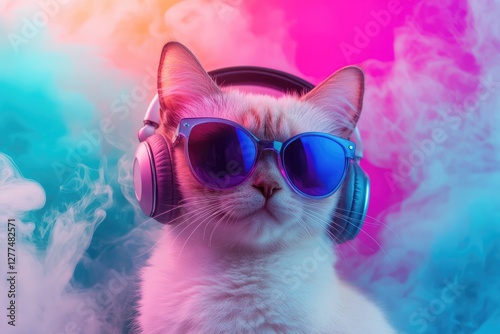 Stylish cat with headphones and sunglasses in neon lighting, ideal for music, party themes, creative branding, digital art, and social media visuals