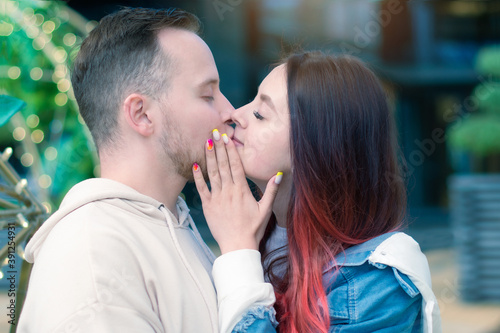 Stylish caucasian couple in love hugging each other while standing outdoors on the street. Love, relationships, romance, carefree and happiness concept. Copy space.