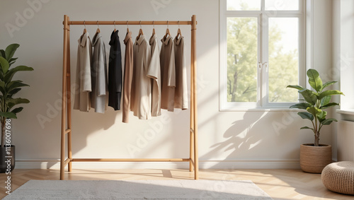 Stylish Clothes Rack with Neutral Clothing in Modern Interior