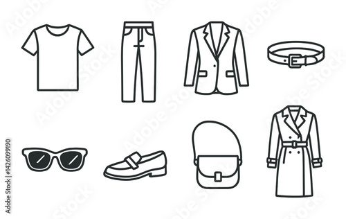 Stylish clothing icon set - linear design featuring fashion essentials for apparel and accessories