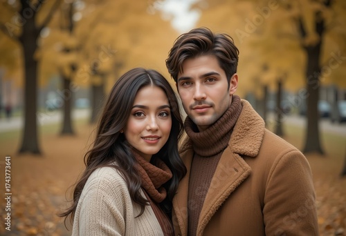 Stylish couple dressed in autumn outfits, brown and beige tones, standing in park with falling leaves, portrait crop focusing on faces and shoulders, soft focus background, warm seasonal mood.