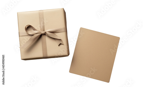stylish craft present or gift box and greeting card on transparent background. flat lay empty paper with space for text. holyday, anniversary concept. mock up. holiday gift, space for text, png