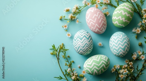Stylish Easter Eggs Composition with Painted Eggs Surrounded by Flowers on a Soft Blue Background for Festive Celebrations