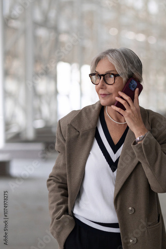 Stylish elderly woman dressed elegantly in a cozy coat talking on her phone inside a modern building during the day