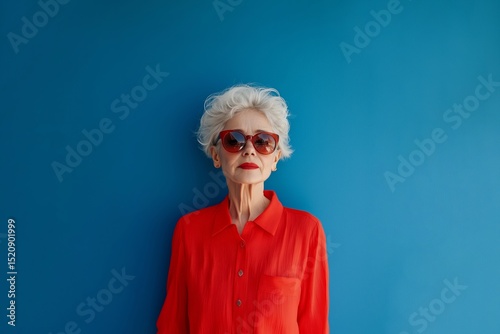 Stylish Elderly Woman in Red Shirt and Sunglasses