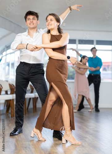 Stylish emotional young hispanic guy in white shirt and black trousers enjoying impassioned merengue with female partner wearing elegant dress in latin dance class. Amateur dancing concept