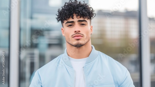 stylish entrepreneur in pastel blue bomber jacket with urban skyline