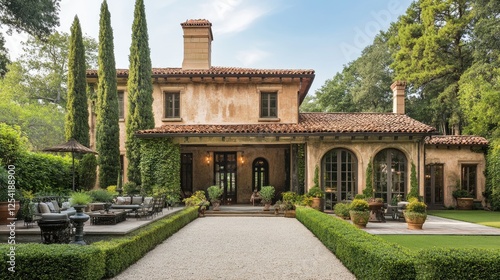 Stylish European-style garden with elegant plants, decorative stones, and sleek outdoor furniture.