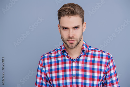 Stylish face portrait of unshaven guy. Man isolated on grey. Millennial man wearing checkered shirt. Casual style of millennial man. Portrait of young man in casual style shirt. Copy space