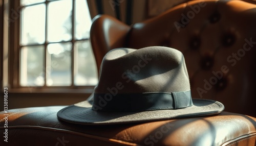 Stylish Fedora Hat Resting on Leather Chair Near Sunny Window Light