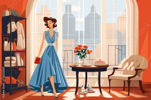 Stylish Female Cartoon Character Illustration: Young Women's Lifestyle and Beauty in Retro Dress, Enjoying Leisure Time at Park