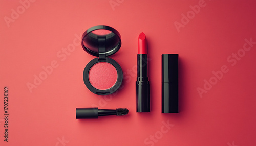 Stylish flatlay of lipstick, blush compact, and nail polish in soft guava tones, perfectly arranged on a monochrome guava backdrop. Minimal design ideal for modern beauty branding