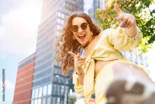 Stylish funny smiling attractive woman in public area kick you in front of big modern urban building. Girl in yellow summer costume and sunglasses traveling to work through business city life.