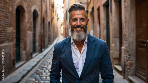 Stylish Gentleman Walking European Cobblestone Street with Historic Buildings and Café Lights
