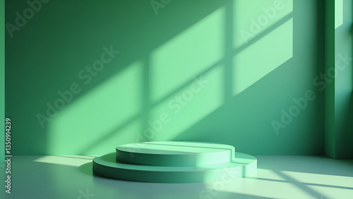 Stylish Green Podium Backdrop for Product Display: Enhance Your Interior Room with Sunlight and Shadows on a Green Concrete Wall - Perfect for Smart Business Presentations
