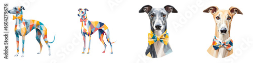 Stylish Greyhound Dogs in Geometric Art with Bow Ties on White Background