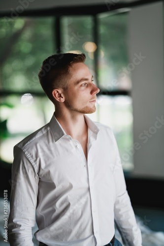 Stylish groom posing in a dark photo Studio. Morning newlyweds.