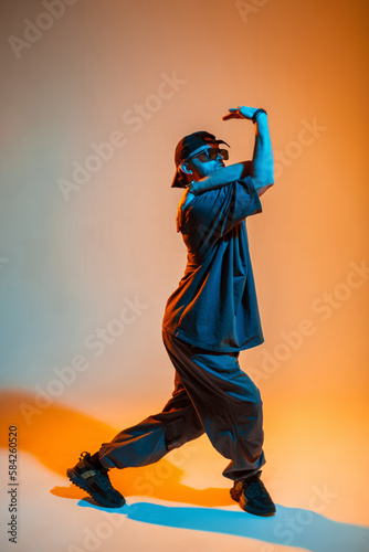 Stylish handsome dancer man with a cap and sunglasses in fashion trendy clothes is dancing in a creative studio with orange and neon lights