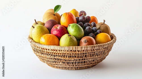 Stylish hand-woven rattan fruit basket with intricate designs and a natural finish, showcasing an array of vibrant fruits against a white background for a contemporary aesthetic.