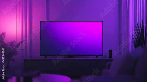 Stylish home theater setup with a large TV glowing under purple ambient light