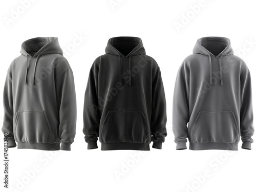 Stylish hoodies mockup in different shades of gray and black, perfect for showcasing apparel designs, fashion brand collections, and urban streetwear concepts