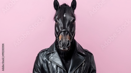Stylish Horse in Black Leather Jacket Against Pastel Pink Background - Unique Animal Fashion Concept