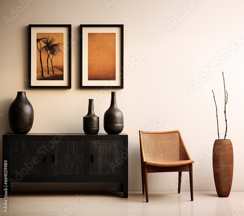 Stylish interior of living room with black mock up poster frame, elegant accessories, flowers in vase, wooden black cabinet. Minimalistic concept of home decor. Template.