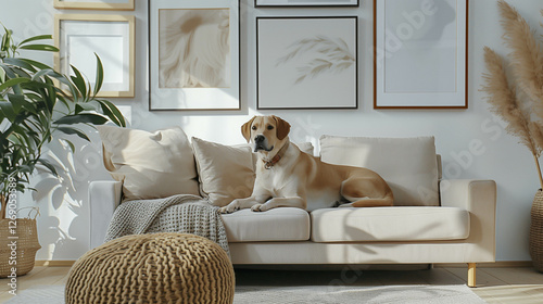Stylish interior of living room with design furniture, gold pouf, plant and dog lying on the sofa in cozy home.
