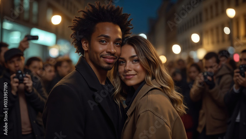 Stylish interracial couple embraces at glamorous night event, surrounded by paparazzi and city lights, exuding confidence and affection