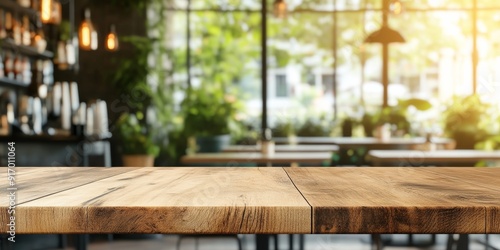 Stylish kitchen bar with a wooden surface, surrounded by a bright and blurred cafe interior, ideal for product display and marketing