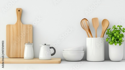 Stylish kitchen display with wooden utensils, white dishware, and a fresh herb plant.