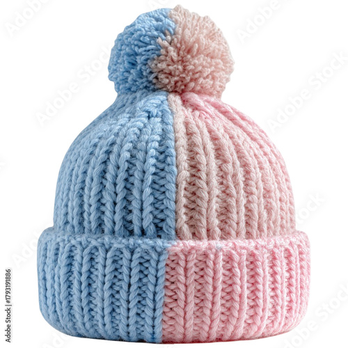 Stylish knitted blue and pink hat with pompom for cozy warmth during winter and fall fashion trends