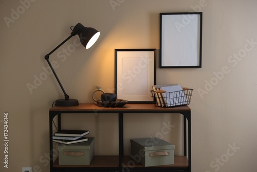 Stylish lamp, other decor and books on console table near beige wall indoors