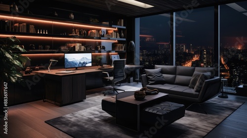 stylish luxury home office interior in an ultramodern brutal apartment in dark colors and cool led lighting