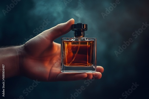 stylish male hand offering cologne bottle, dark and elegant background
