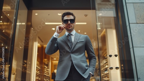 Stylish man in a suit poses in front of a modern eyewear store during the afternoon