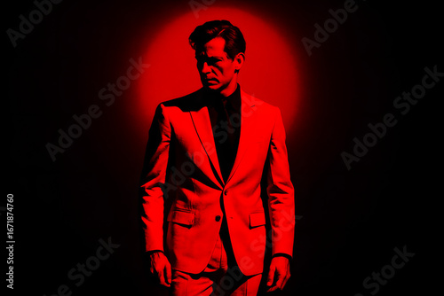 Stylish man in a suit under dramatic red spotlight creating a cinematic noir-inspired portrait with intense atmosphere