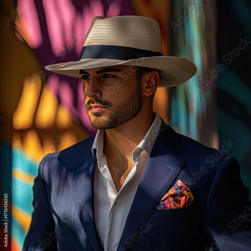 Stylish man in cream straw hat and navy suit