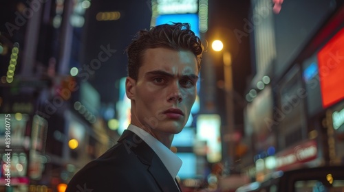 Stylish man in suit standing in city at night