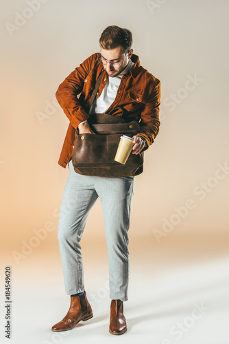 stylish man with coffee to go in hand looking for something in bag