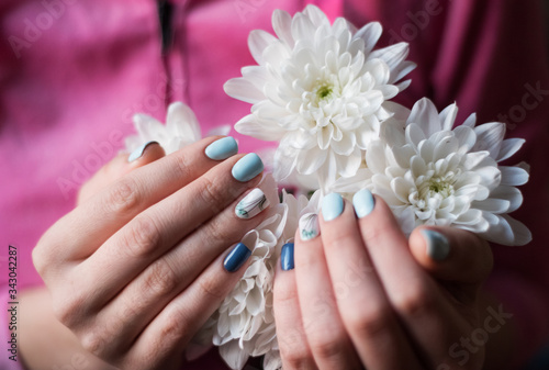 Stylish manicure in cold tones on the girl 's hands against a background of white chrysathemums.