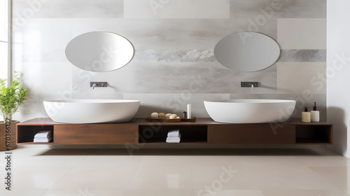 Stylish marble bathroom with large oval bathtub and twin washbasins With copyspace for text
