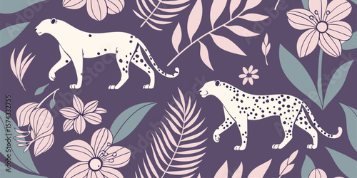 Stylish modern , Seamless Pattern with leopards Tropical Leaves, and Flowers wallpapers silhouette in purple background vector illustration.