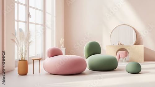 Stylish, modern furniture in soft pastel colors, enhancing a bright and airy interior space with decorative accessories.