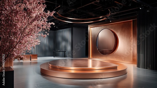 Stylish modern interior with copper accents, wooden stage, and cherry blossom decor, perfect for presentations and events.