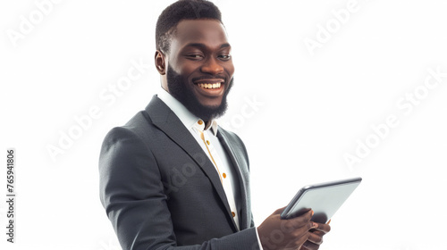 Stylish, modern man smiling at camera and using a tablet in his hands.