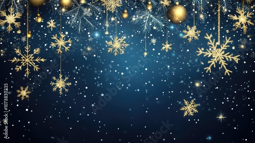 Stylish navy blue festive backdrop adorned with shimmering snowflakes and golden sequins